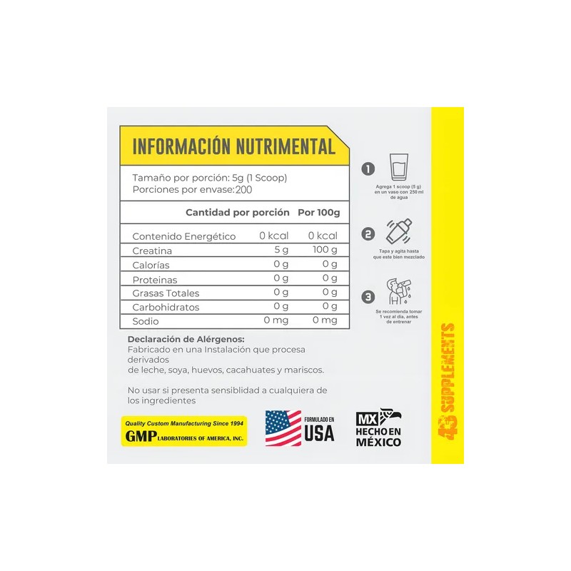 43 Supplements Creatina Monohidratada 1 Kg 200 Servicios Sabor Sin Sabor