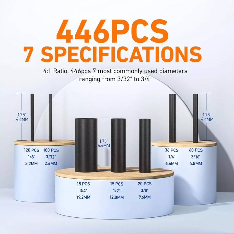 - 1.Pakage Included: Upgrade 446pcs 4:1 Ratio,7 most commonly used diameters ranging from 3/32" to 3/4". Shrink tubing is precut to 1.75" inches.