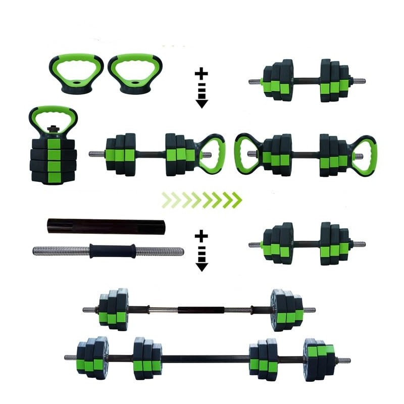 - 44 Lbs Package List: 4 x 2.5 lbs weights, 4 x 3.5 lbs weights, 4 x 4.5 lbs weights, Dumbbell bars x 2, Barbell connector x 1, Kettle bell bar x 1, Push-up handles x 2, buckles x 8.