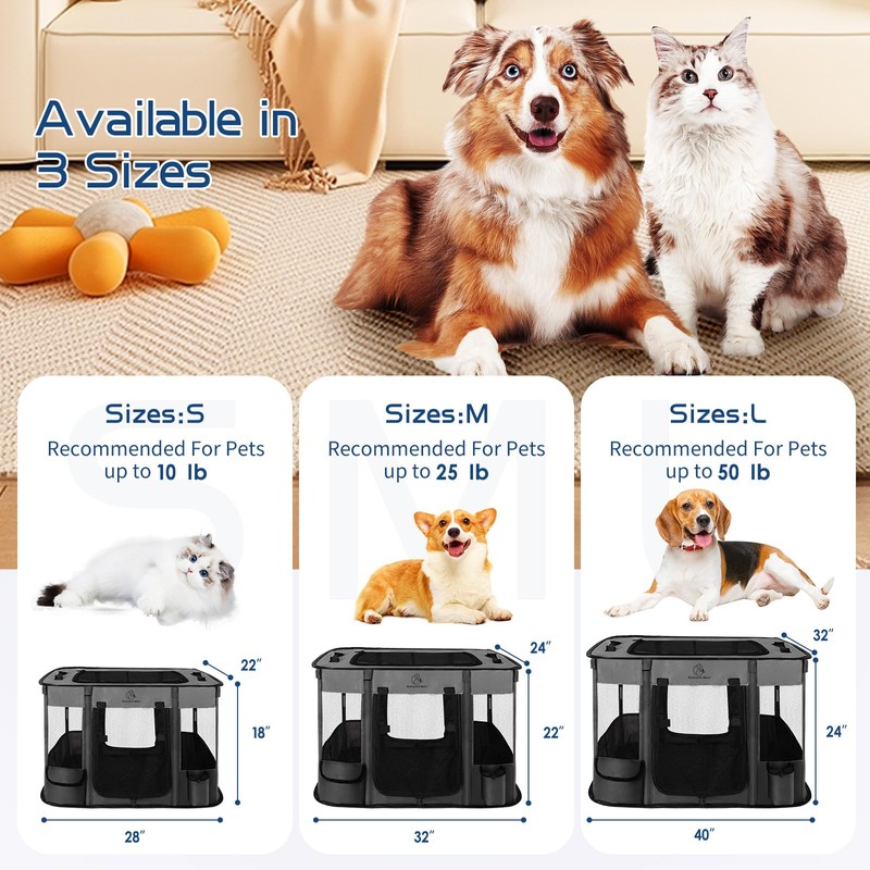 - SUITABLE DIMENSIONS: Playpen Size :44"L x 34" W x 24 "H (S). Compared with the pet playpen on the market, our dog playpen is the largest size and it is a new and upgraded style.Two rollable mesh doors with locking zippers provide easy in/out access for your pet.There is an accessory pocket and a water bottle pocket and two snack lanyards on the playpen. Elastic straps-easy to fix after folding, soft pet playpen also features a handle bar for dragging purposes, lightweight and easy to carry