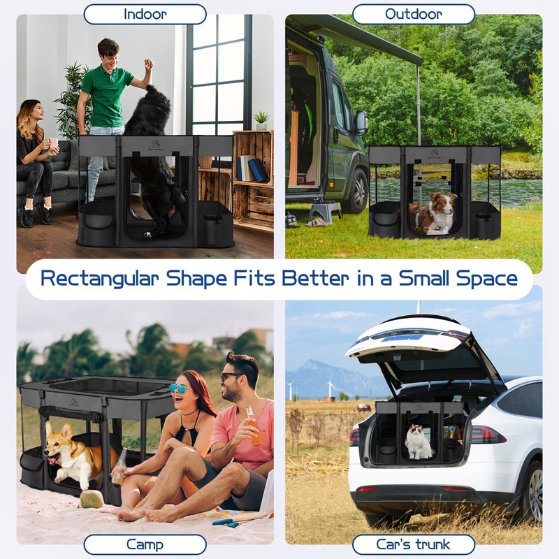 - NEW DESIGNED FOR PETS:Dog playpen tent promotes comfort and security, providing your pet a secure enclosed space. Rectangular shape saves more space.The 360-degree light mesh window view and ceiling deliver great airflow, as well visibility for anxious pets and owners. This dog playpen keeps your pet stay in this pet playpen secure, spacious interior making it more fun for your pet.US Patent Registered
