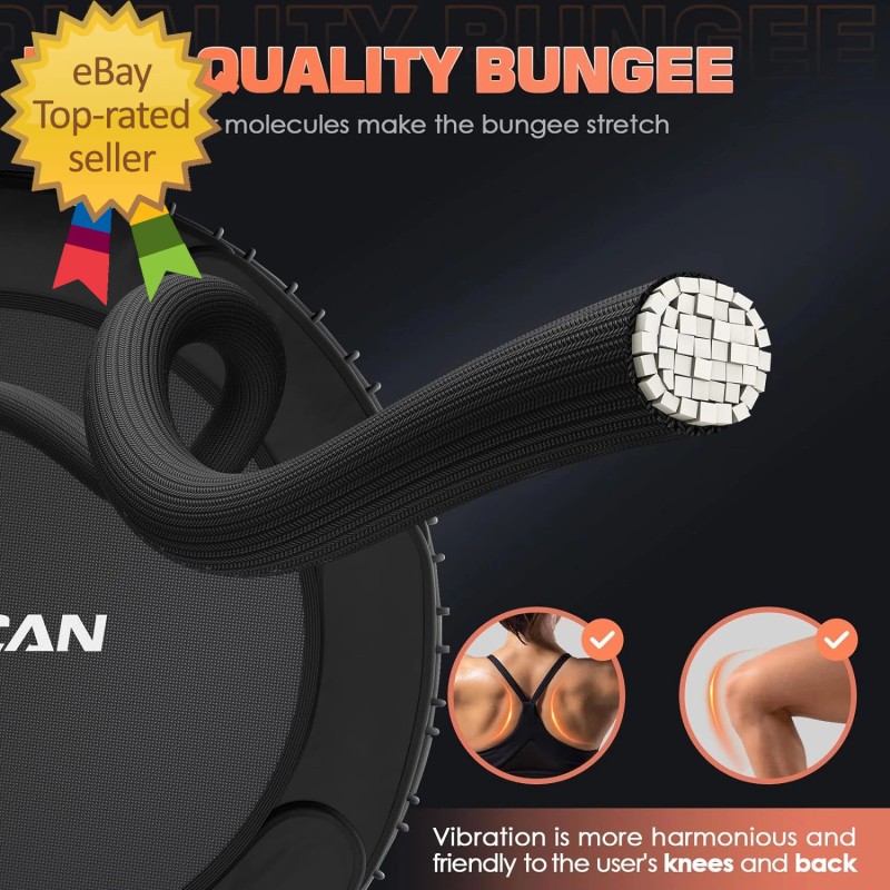 - High-Quality Bungee: BCAN trampoline uses high-quality synthetic bungee, can buffer nearly 85% of the vibrations, provide more sustained and softer elasticity, and protect Knees, Back and Joints, a great choice for health, aerobic exercise, relax