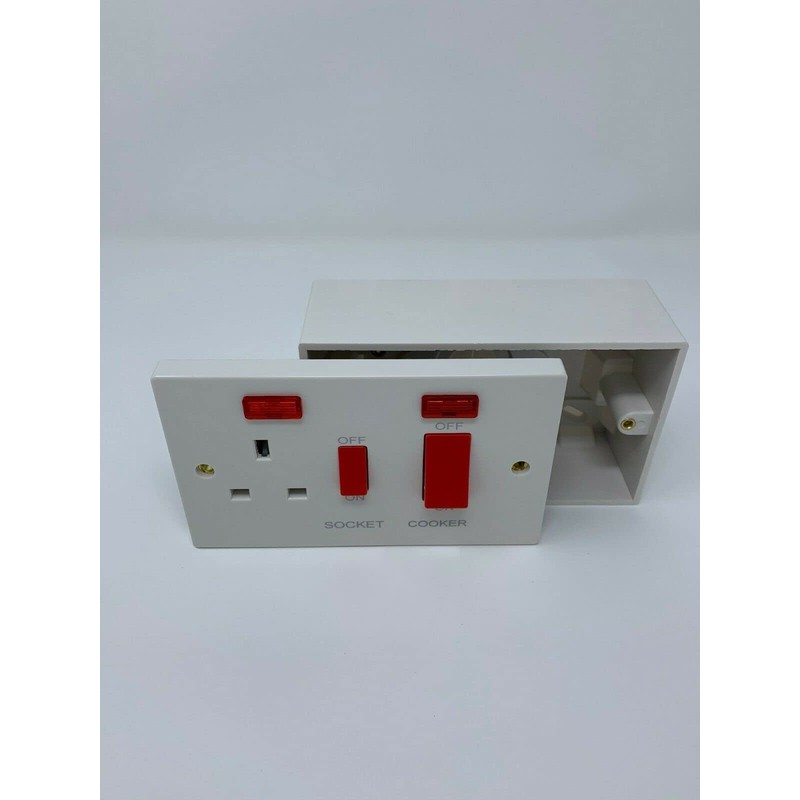 Cooker Switch & Socket with Pattress Box Double Pole 45 Amp Cooker control unit with switched socket. Deep pattress surface box 47mm. Double 2 Gang. 45 Amp double pole. Large terminals to accept thicker cables. Neon indicator light. Fitting screws included. Comes with fitting instructions. CE Approved conforms to BS 4177. Specifications Cooker & Socket Switch Square Edge Finish: White Inserts: N/A 45 Amp Switched with Neon Height: 85mm Width: 144mm Depth: 12mm