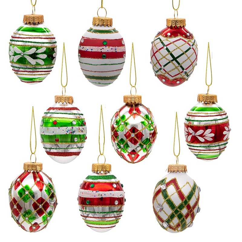 45MM Glass Red and Green Decorated Eggs, 9 Piece Set