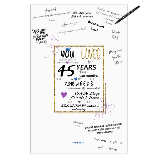 - 45th BIRTHDAY PARTY DECORATIONS: Our 45 Years Loved signature poster is printed on high-quality paper, laminated, with matte finish, and comes in size of 11 x 17 Inches. Bundled with a permanent marker to write on it, this poster is a great guest book alternative for her or his next special birthday party. A keepsake poster that will keep all your birthday wishes and will fit perfectly into your home decor.