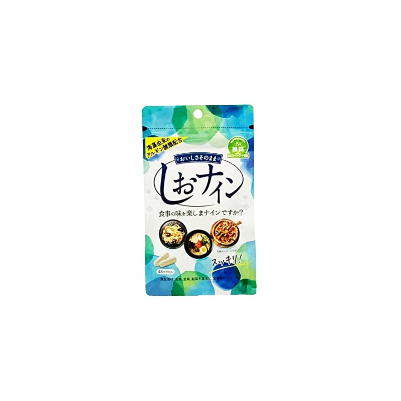 ○商品名 アルギン酸類配合サプリメント しおナイン ○商品説明 ・しおナインは食事をポジティブにする新しいタイプのサプリメントです。 ・カリウムをほとんど含まない(1カプセルあたり0.22mg)ため、カリウムの摂取が気になる方にも安心です。 ・玉ねぎの成分と海藻より抽出したぬめり成分のWパワーで食事をポジティブにします。 ○ご使用方法 食事の前や後などに1回3カプセル・1日1~3回を目安に水などと一緒にお召し上がりください。 〇こんな方におすすめ ・食事の味を楽しみたい ・食事でモヤモヤする ・いろいろ気になって楽しめない ○栄養成分表示 3カプセル当たり ■3カプセルあたり エネルギー3.01kcal、たんぱく質0.12g、脂質0.004g、炭水化物0.62g、食塩相当量0.006g ○原材料名 玉ねぎパウダー(国内製造)/アルギン酸Ca、アルギン酸アンモニウム、HPMC、セルロース
