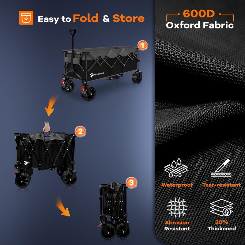 - ใ๐ญ๐ฌ.๐ฏ๐ฒ ๐ฐ๐ ๐ณ๐ ๐๐ฎ๐ฟ๐ด๐ฒ ๐๐ฎ๐ฝ๐ฎ๐ฐ๐ถ๐๐ ๐๐ถ๐๐ต ๐ฆ๐บ๐ฎ๐น๐น๐ฒ๐ฟ ๐๐ผ๐น๐ฑ๐ฒ๐ฑ ๐ฆ๐ถ๐๐ฒ ๐ฃ๐ผ๐ฟ๐๐ฎ๐ฏ๐น๐ฒ ๐๐ผ๐น๐น๐ฎ๐ฝ๐๐ถ๐ฏ๐น๐ฒ ๐๐ฒ๐ฎ๐ฐ๐ต ๐ช๐ฎ๐ด๐ผ๐ปใOriginsure foldable wagon cart, 48.43 "L x 24.02 "W x 24.41 "H large unfolding size, 10.36 cu ft/300L massive storage space, triple the capacity of similar wagons. Adopting an innovative folding design that maintains its height, the Capacity reduces to 1.36 cu ft when folded, only 1/3 of other carts. Compact and space-saving, it can be perfectly stored in the car trunk and room corners.