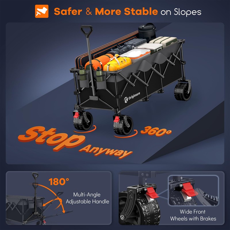 - ใ๐ฏ๐ฒ๐ฌ ๐ฅ๐ผ๐๐ฎ๐๐ถ๐ผ๐ป ๐จ๐ป๐ถ๐๐ฒ๐ฟ๐๐ฎ๐น ๐๐น๐น-๐๐ฒ๐ฟ๐ฟ๐ฎ๐ถ๐ป ๐๐ถ๐ด ๐ช๐ต๐ฒ๐ฒ๐น๐ ๐๐ถ๐๐ต ๐๐ฟ๐ฎ๐ธ๐ฒ๐, ๐ฆ๐๐ถ๐๐ฎ๐ฏ๐น๐ฒ ๐ณ๐ผ๐ฟ ๐ฉ๐ฎ๐ฟ๐ถ๐ผ๐๐ ๐ฅ๐ผ๐ฎ๐ฑ ๐ฆ๐๐ฟ๐ณ๐ฎ๐ฐ๐ฒ๐ใThis beach carts features 4 larger and wider 7"x4" double bearings all-terrain big wheels, allowing for flexible steering and smooth rolling on various road surfaces such as mud, grass, and hard sand. The two 360ยฐ rotation front wheels with brakes, effectively to stop and prevent the wagon from moving. It' s shock-absorption and noise-reduction, ensuring durability and resistance to wear and tear.