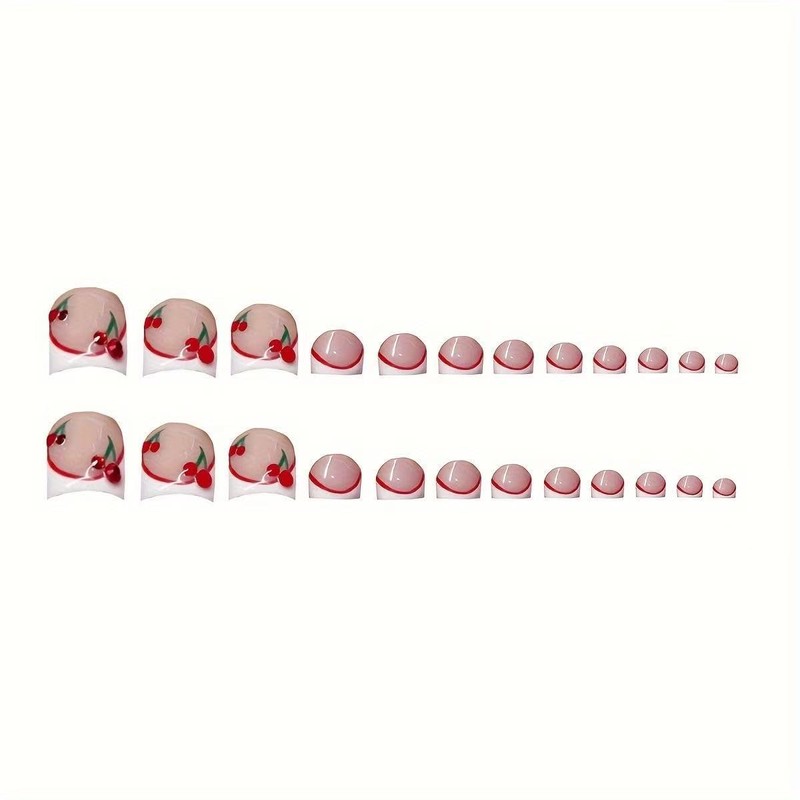 48 Pcs Long Press on Nails Square & Press on Toenails Set, White French Tip Fake Nails with 3D Cherry Design Glue on Toe Nails Short False Toenails Glossy Acrylic Artificial ToeNails for Women