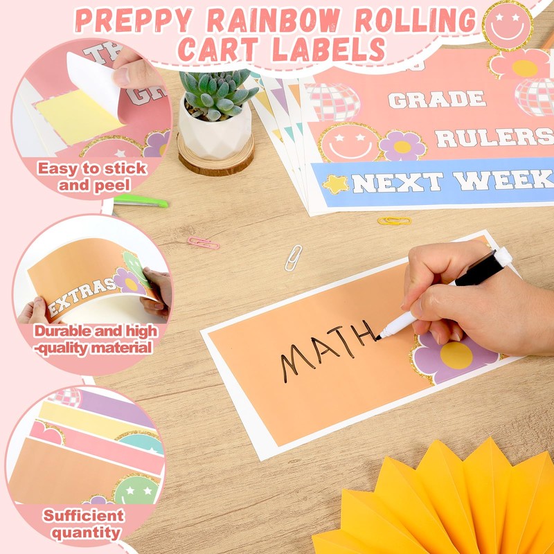 - Preppy Classroom Decor: Each drawer label features pastel colors with playful flowers, rainbows, and smiley faces. The design adds charm while helping keep the classroom tidy. These 10-drawer teacher rolling cart labels make organizing more enjoyable and bring a cheerful look to any learning space.