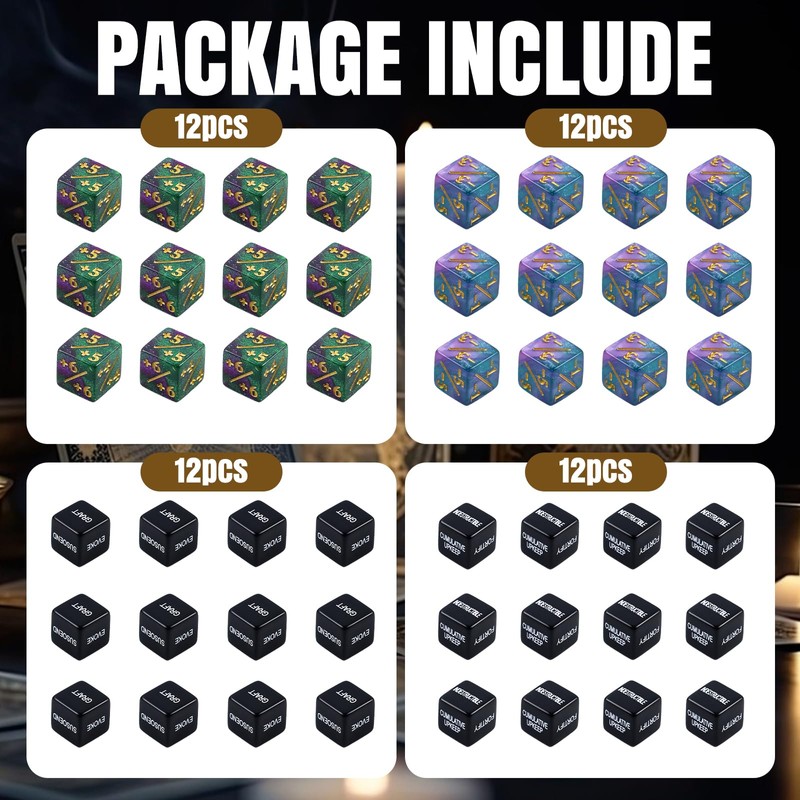 - Contains: 24 MTG keywords dice+24 pcs dice token+1 velvet pouch
