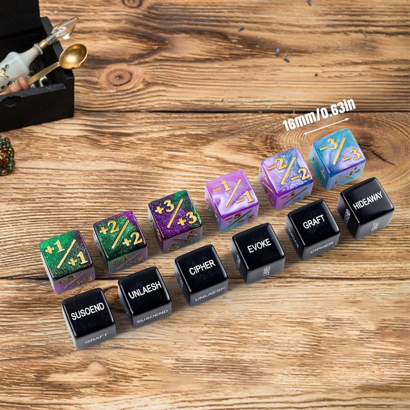 • WHAT YOU GET:24 pcs MTG keywords dice(UNLAESH,CIPHER,GRAFT,SUSOEND,EVOKE,HIDEAWAY CONSPIRE,CUMULATIVE UPKEEP,INDESTRUCTIBLE,CHANGELING,MODULAR,FORTIFY),24pcs token dice counters(12 pieces -1~-6 counters & 12 pieces +1~+6 counters) with velvet pouch.enough for your daily game use and replacement, and even for your school, bar, and club games
