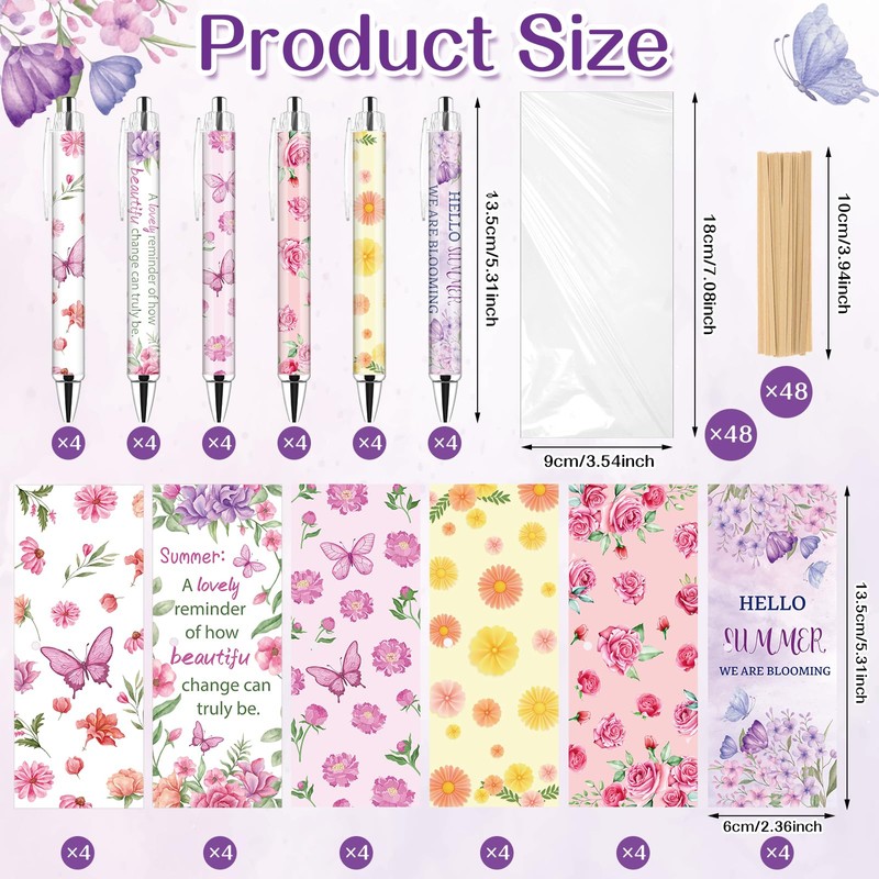 - Sweet Summer Fun in Every Stroke: 48 elegant butterfly flower themed rolling ballpoint pens, 6 unique designs, 48 matching greeting cards, 48 crystal-clear OPP bags, and 48 secure cable ties. Perfect for journaling, doodling, or brightening up office meetings