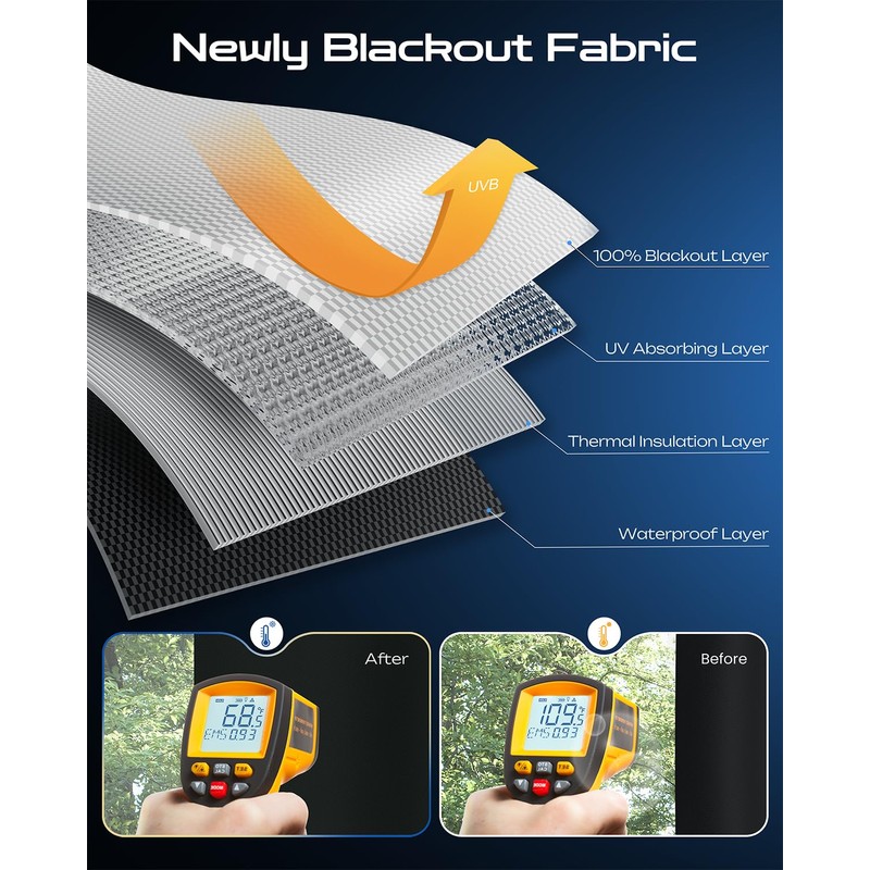 - 100% Blackout - Made of ultra-dense triple-layer polyester fabric and integrated with innovative nano-coating technology, these blackout blinds block all sunlight, UV rays, and artificial light sources. The innovative coating reflects 90% of heat, ensuring a cool environment while creating a pitch-black space. They are ideal for shift workers, nurseries, and those prioritizing privacy, as they transform any room into a serene, light-free haven