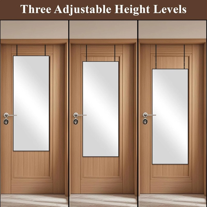 - Adjustable Installation Height: Our door-hanging mirror offers three adjustable height options. Each hook is designed with four pre-drilled holes, allowing you to choose the perfect height for installation based on your specific needs. Although the hanging mirror offers different height options to accommodate various door heights, both hooks should be set at the same level to ensure proper and safe use of the product