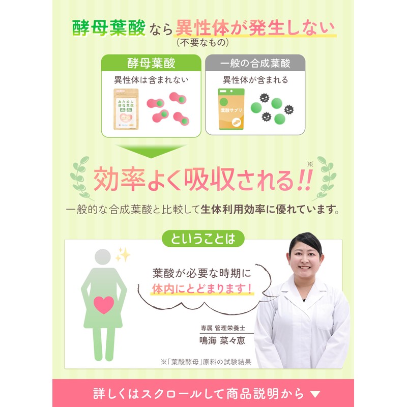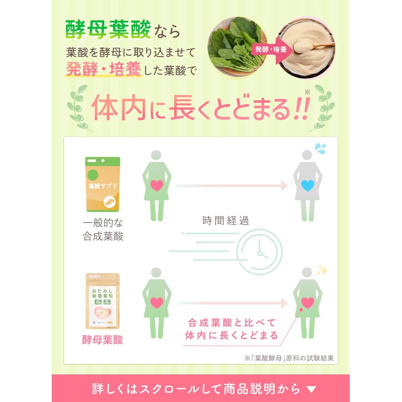 - 【モノグルタミン酸型の酵母葉酸100%】酵母に葉酸(モノグルタミン酸型の葉酸)を含有させて培養した「酵母葉酸100%」の葉酸サプリです。一般の合成葉酸とは体内への吸収率が異なり、体内にとどまる時間が長いので、効率よく葉酸を摂取できることが特徴です。