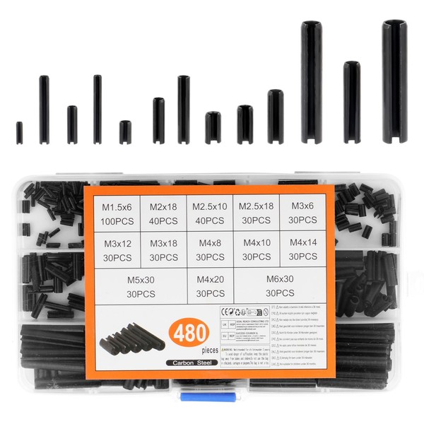 480 Piece Tension Pin Hollow Cotter Pins Set, Tension Pins Assortment, Hollow Spring Pins, Locking Pin, Manganese Steel Hollow Cotter Pin Notched Pins (M1.5/M2/M2.5/M3/M4/M5/M6)
