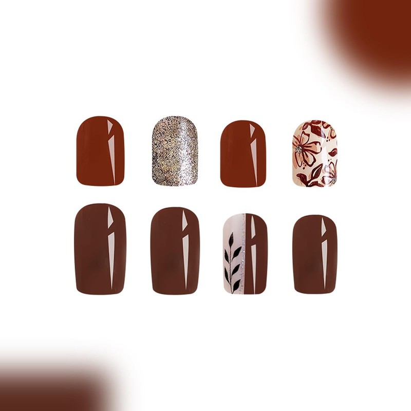 48Pcs Brown Press on Nails Short Square Fake Nails with Leaf Design Flower False Nails Glitter Glossy Acrylic Nails Fall Full Cover Reusable Stick on Nail for Women Girls Art Decoration