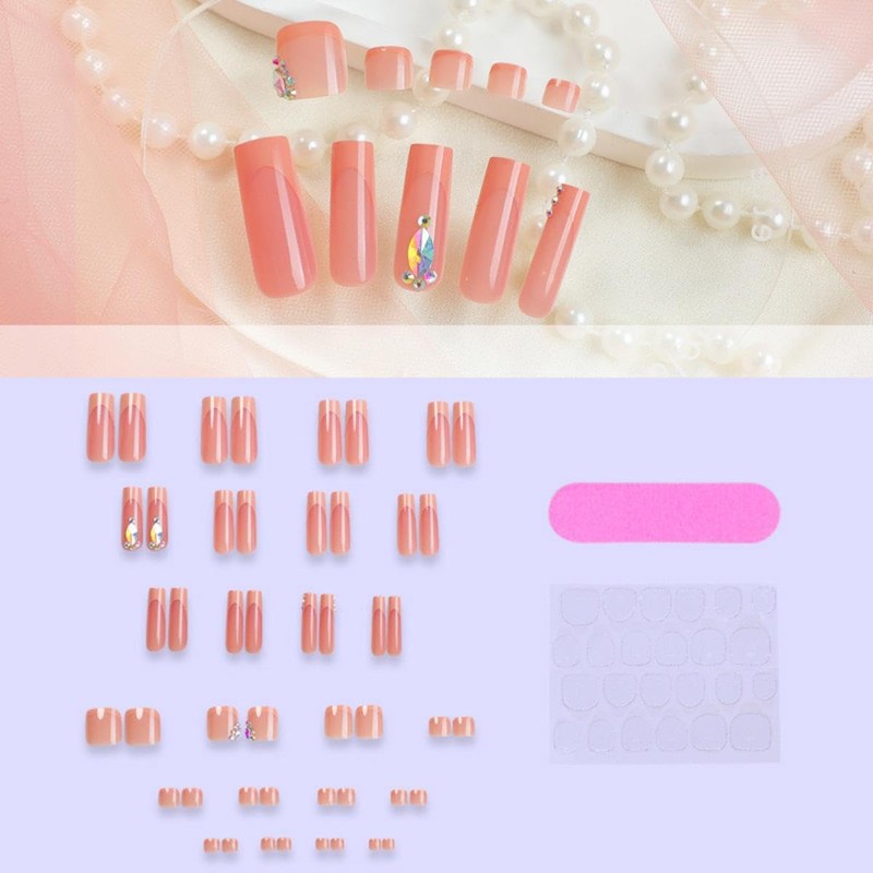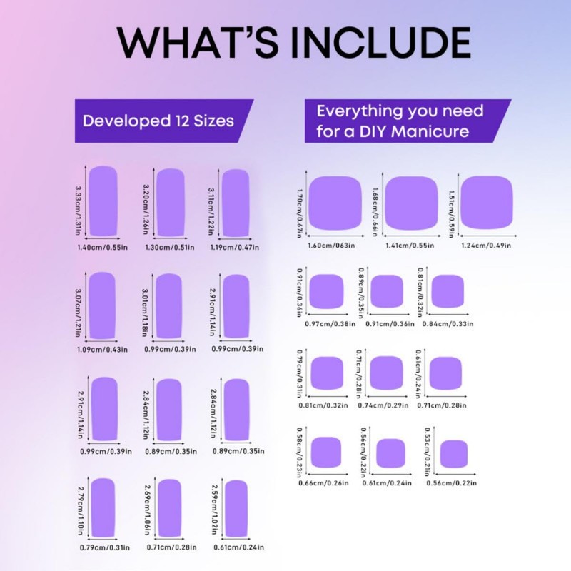 - Package Contains: Packaged with 24pcs long square press on nails, 24pcs orange french tip press on toenails, 48pcs jelly glue stickers, 2pcs nail file, 2 wooden stick. 12 sizes fake nails can repeated use, suitable for different size of nails. (Durability of jelly glue is not as good as liquid glue, but it makes false nails reusable. Jelly glue can last about 3 days or more, glue remains longer.Please use your suitable glue according to different scenes)