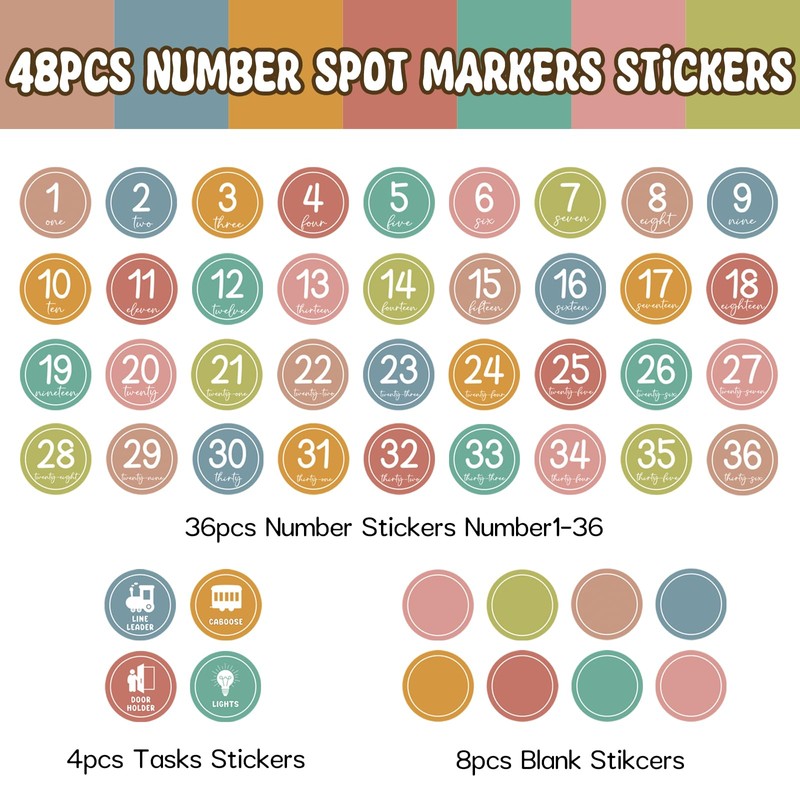 - Number Spots Stickers: Package includes 48pcs boho number line up spots for classroom floor from 1 to 36, 4pcs of unique task stickers and 8pcs of blank stickers for personalized. Enough quantities numbers line stickers for classroom back to school teacher supplies. Number spot markers stickers will create a well-organized learning environment, keeping students engaged and ensuring a clear seating arrangement