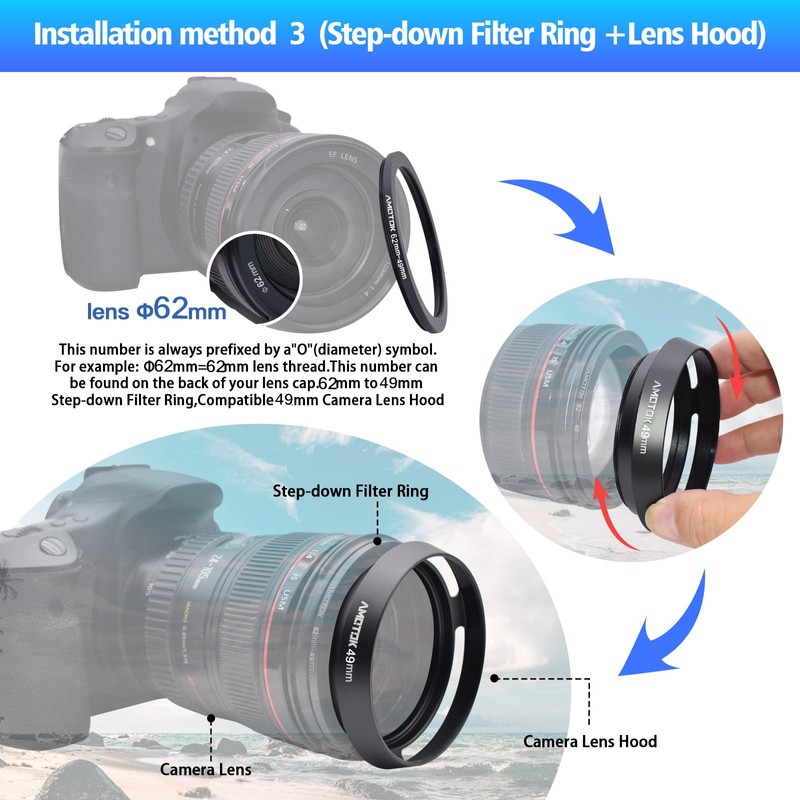 - 【4】49mm Lens Hood Compatiable: For To the side of the lens:49mm (All Brands Ø49mm).Your lens thread size will be printed underneath your lens or written somewhere on the lens barrel.This number is always preceded by a "Ø" (Diameter) symbol.For example:ø49=49mm lens thread size.Make sure you order the correct size otherwise it will not fit your lens.