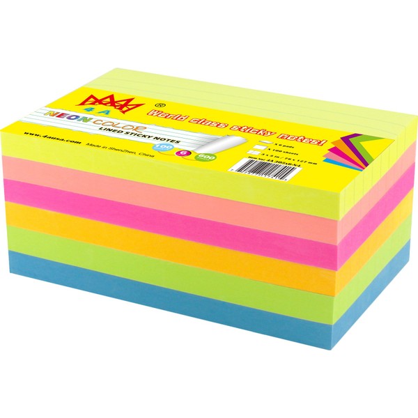 4A Sticky Notes,3 x 5 Inches,Neon Assorted,Lined,Self-Stick Notes,100 Sheets/Pad,6 Pads/Pack,4A 305x6-N-L