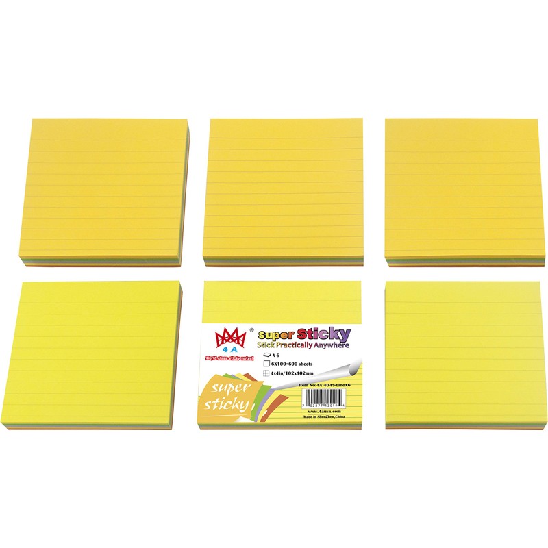 4A Super Sticky Notes,4 x 4 Inches,Large Size,Neon Assorted,Lined,Self-Stick Notes,100 Sheets/Pad,6 Pads/Pack,600 Sheets/Pack,4A 404S-Linex6