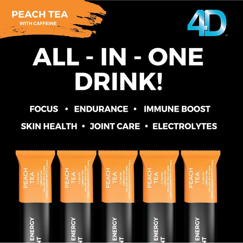 4D Clean Energy Drink Mix + Electrolytes + Immune Support + MultiVitamins + Joint and Skin Support (Peach Tea Flavor with Caffeine, 25 Pack)