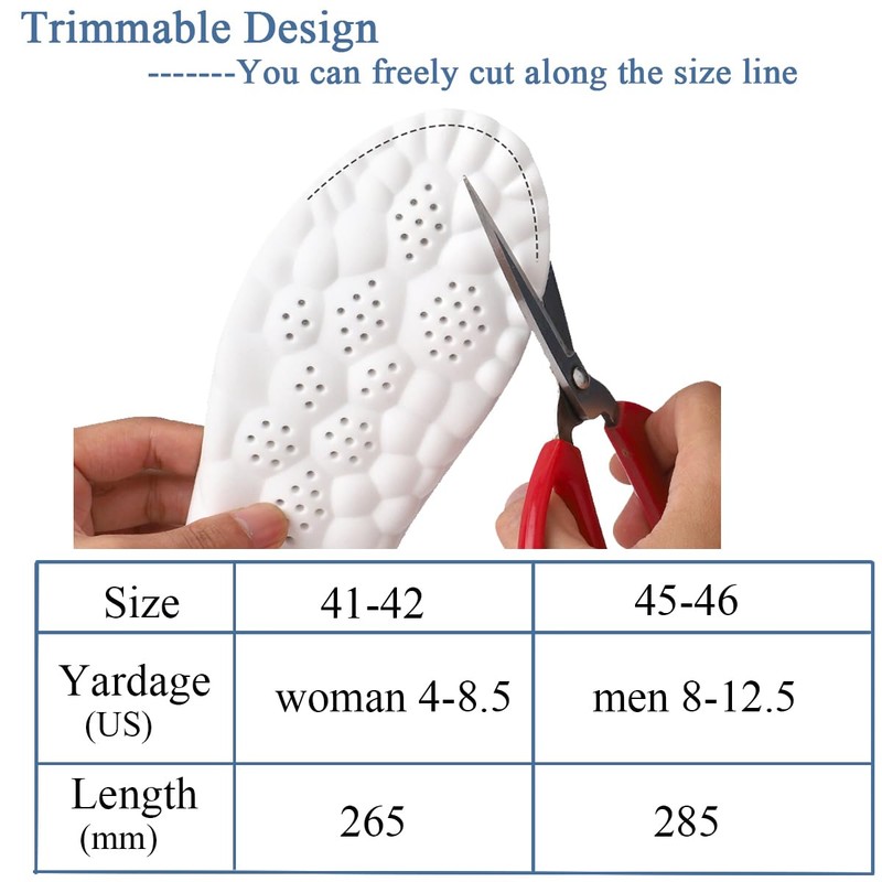 - This cloud insoles comes in two sizes, the large size is 285mm, suitable for sizes 40-46, suitable for men, and the small size is 265mm, suitable for sizes 36-42, suitable for children and women. You can freely cut according to the length of the shoes for your convenience, and it is best to cut the appropriate length based on the old insole