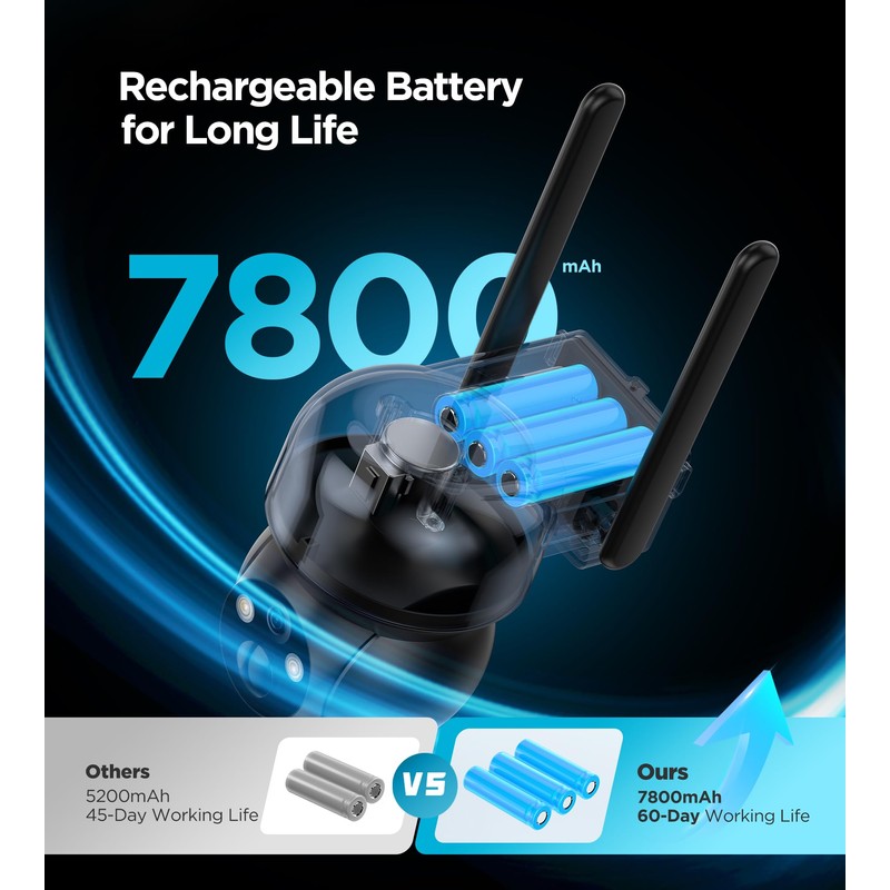 This camera is equipped with 3W solar panel renewal, no need to punch holes and drill walls, truly wireless installation.7800mAh high-capacity battery can support the camera to protect the family security for a long time, even if you are out of the house, do not have to worry.
