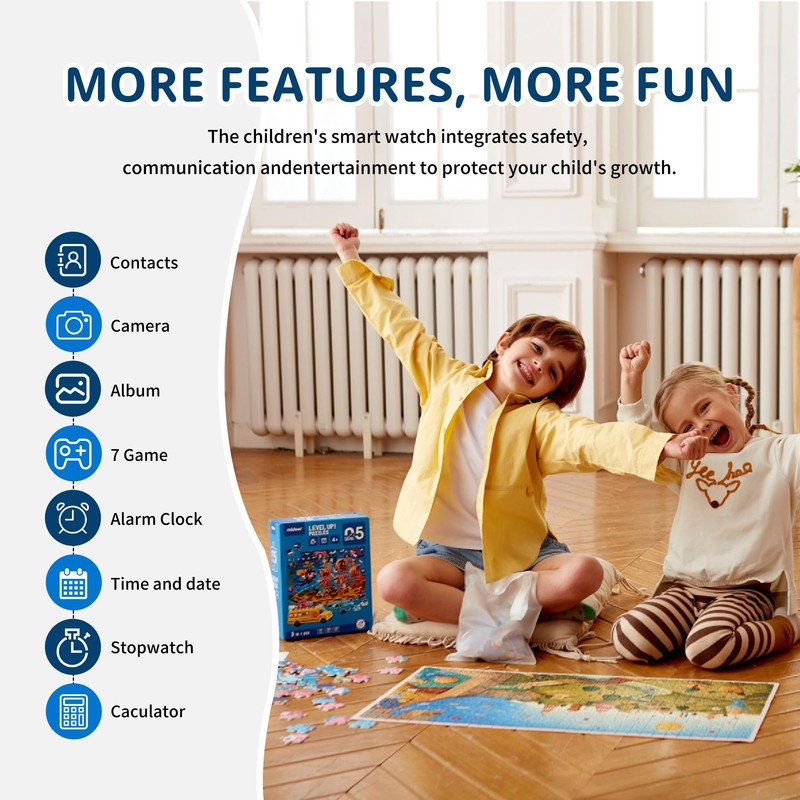 • More functions, more fun: Kids smartwatch is equipped with alarm clock, stopwatch, games, calendar, calculator and many other functions. It offers all the functions your child needs for daily life and learning. Thanks to the waterproof IP68 design, children do not have to worry about rain, sweat and splashes, they can wear them at any time and enjoy their childhood fun.