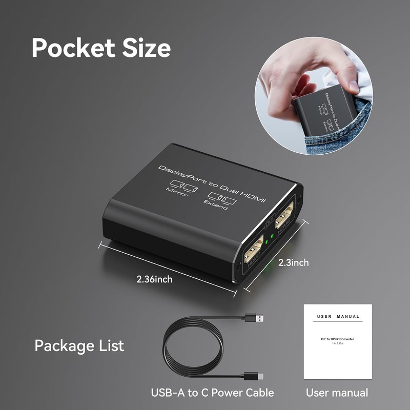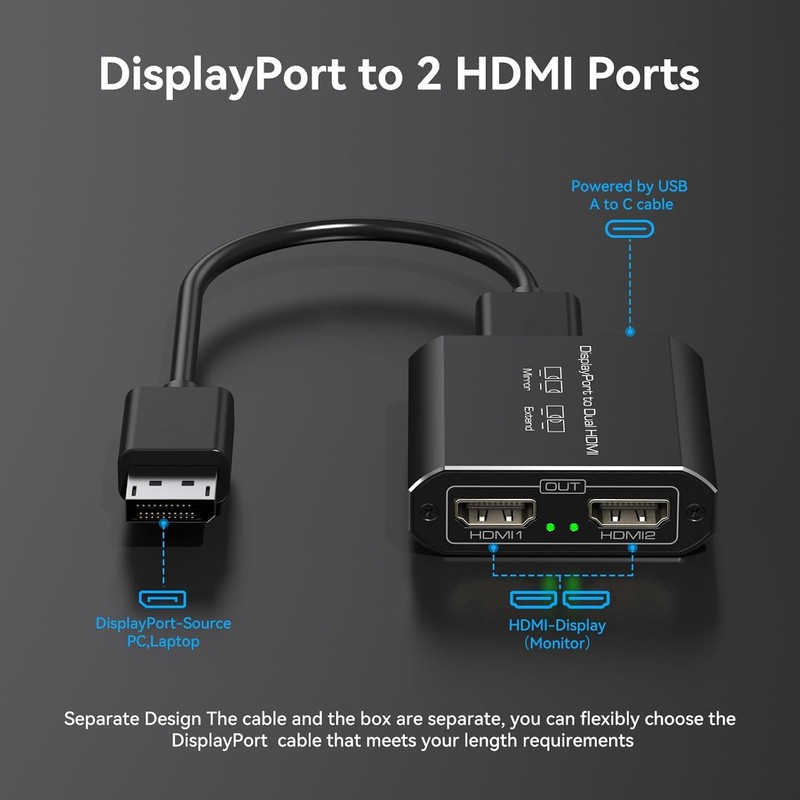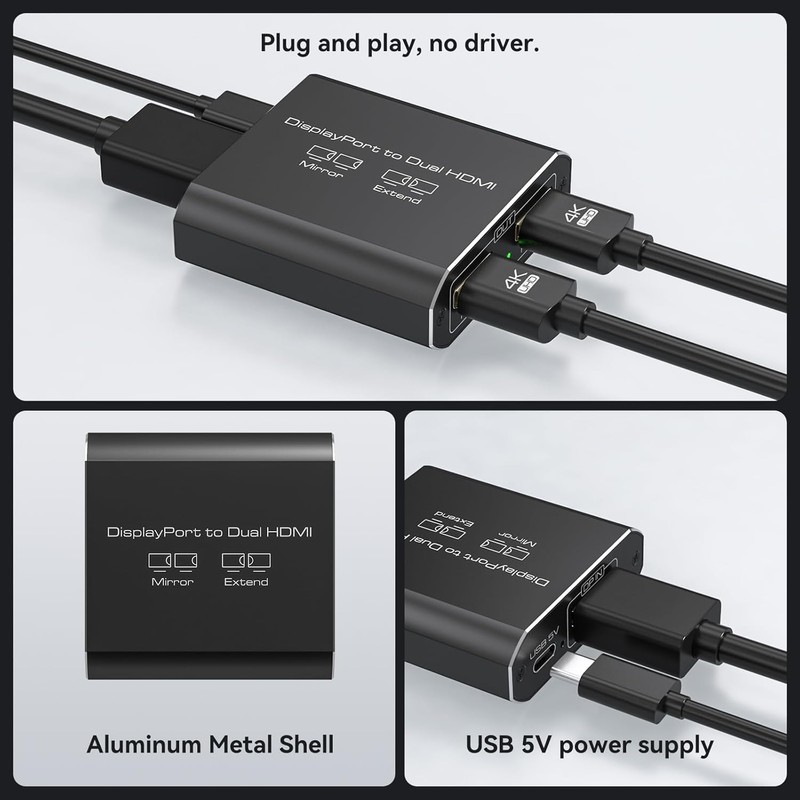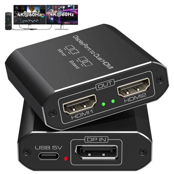 • DisplayPort to Dual HDMI Splitter:DisplayPort to HDMI extended display splitter is a versatile solution for converting a DisplayPort signal into two HDMI outputs, supporting both extended and mirror modes. Your two HDMI monitors can display different windows instead of having to tab back and forth to view data. Perfect for expanding your workspace or enhancing your gaming experience; Note: Bidirectional transmission is not supported