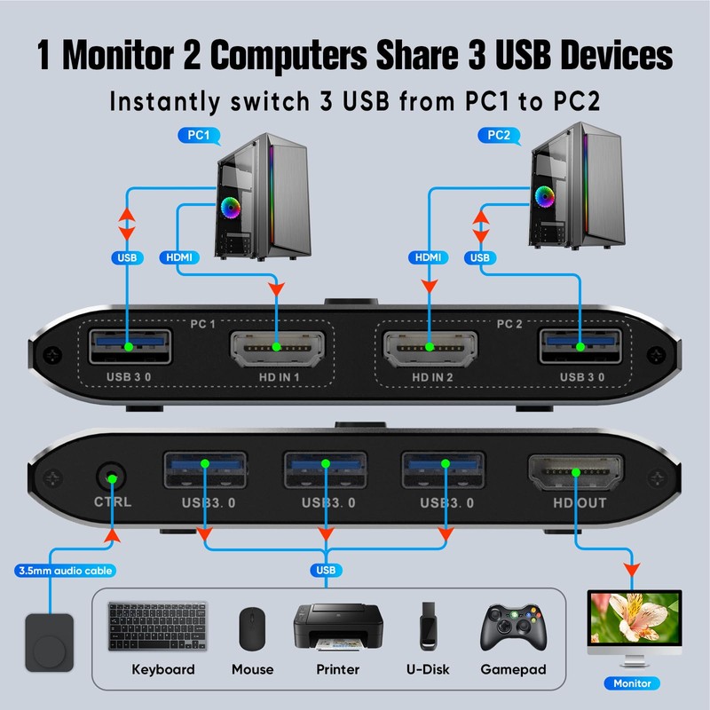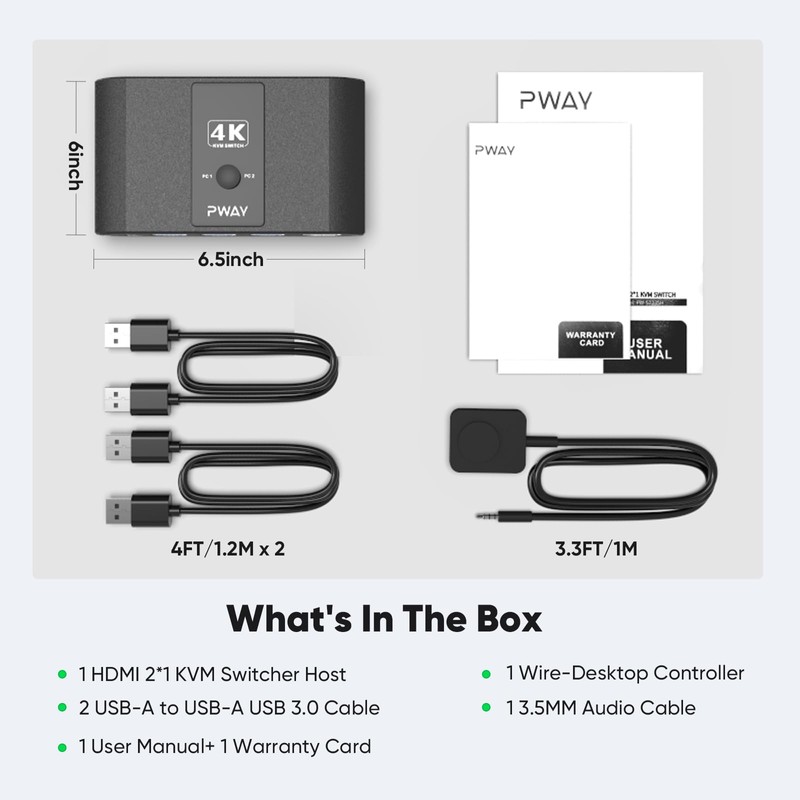 - 【All-inclusive Package & Reliable Support】2-port HDMI KVM switch package includes: 1*HDMI KVM switch host, 1*wired desktop controller, 2*USB-A to USB-A USB 3.0 cables (1.2m), 1*3.5MM audio cable (1m), 1*user manual. If you have any questions or concerns, please contact us directly with your order number. We are committed to providing you with timely and satisfactory solutions.