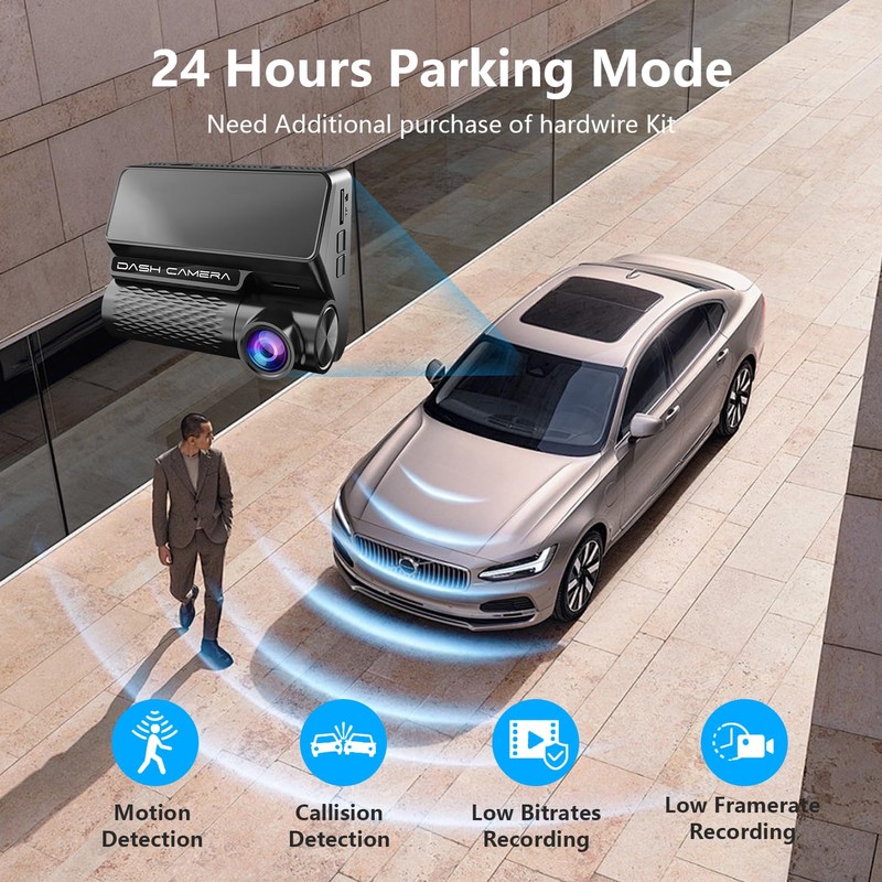 - 【24 Hours Parking Mode】With low bitrate recording parking mode, the dash cam will keeps recording continuously and decreases the quality of the video to maximize the recording quantity. While the motion detection or collision detection parking mode allows the camera to automatically initiate recording when triggered by a motion or collision event.To enable parking mode,Need buy Additional hardwiring kit (not included)