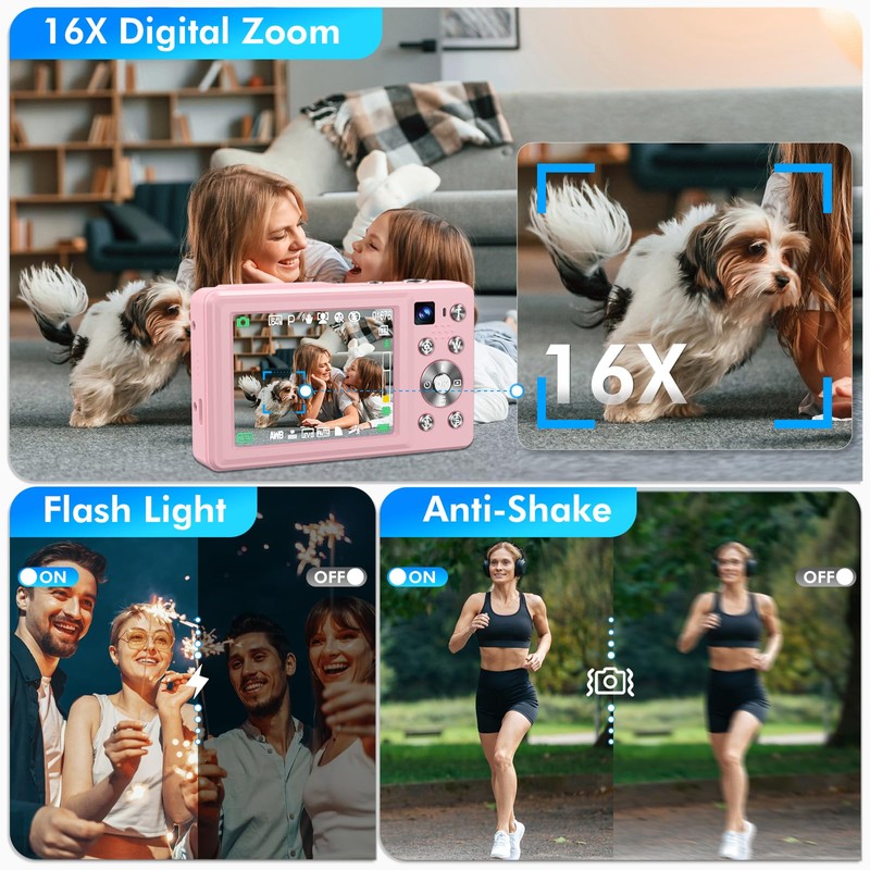 - 【16X Digital Zoom & Multifunctional】- Get closer to your subject with 16X digital zoom. Frame your shots easily on the bright and clear 2.8-inch IPS display. This compact digital camera also works as a webcam, it supports recording while charging, so you'll never miss a moment. The pause function allows you to pause recording easily.