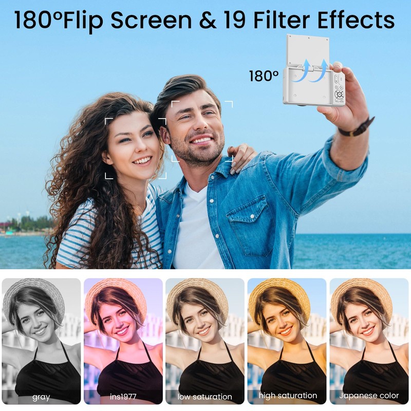 - 3.0" 180° Flip Screen Camera: The 3.0 inches 180° flip screen camera, making it easy to frame yourself for stunning selfies and vlogs. This portable compact digital camera is perfect for travel, vacations, and everyday use, fitting easily in your pocket or bag.