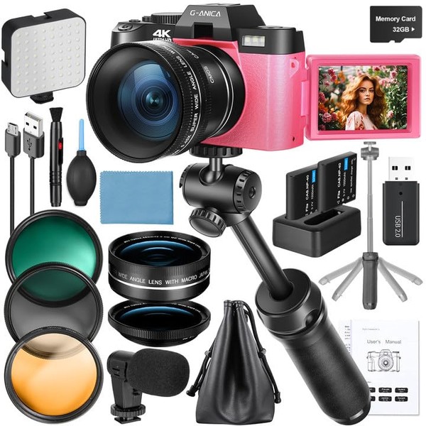 - 【Rich 4K Digital Camera Kit】 G-Anica vlogging camera kit contains 4K camera * 1, microphone * 1, tripod * 1, filter * 3, wide-angle lens * 1 and macro lens * 1, cleaning kit * 1, fill light * 1, 32G SD card * 1, card reader * 1, battery * 2, charger * 1, camera bag * 1 and lanyard * 1. Numerous accessories have strong practicality, making your photography more interesting