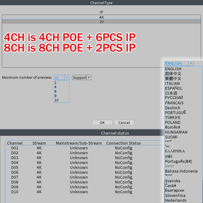 A note on video recorder compatibility: 1: This video recorder supports ONVIF protocol and NETIP protocol. It can only support cameras with one of these two protocols. 2: Under the ONVIF protocol, only the camera screen can be displayed, the camera cannot be configured, and the functions of face detection, humanoid detection, and vehicle detection cannot be used. 3: The NETIP protocol can support face detection, humanoid detection, and vehicle detection functions. The camera must also support these functions, otherwise it cannot be used. 4: The camera’s IP address can be searched through ONVIF or NETIP protocol. If your camera cannot be searched, you need to check whether the camera can work normally. 5: It can only support new monitoring-specific hard drives. If your hard drive cannot be read, first check whether the power supply meets the working conditions of the hard drive. Large-capacity hard drives require replacement of the power supply. 6: The POE mode of the video recorder is 12+36-&data and does not support non-standard format POE.