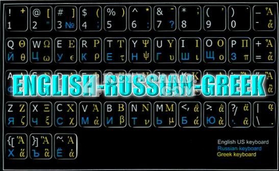Keyboard sticker for any Laptop, Desktop or Notebook black color of background High-quality stickers for variety of existing keyboards Desktop, Laptop and Notebook such as: Sony, Toshiba, HP, Dell, Compaq, Panasonic, Acer, Gateway, Sharp, eMachines, Ashton Digital's Passport, Averatec, Systemax, IBM, Lenovo, NEC, Alienware, AST, Asus, Samsung, Cybertron, Apple … etc. The Russian - Greek - English alphabets are spread onto non-transparent - matt vinyl, in black color which are suitable for majority of keyboards. The Russian - Greek - English stickers are made of high-quality non-transparent (black or white) - matt vinyl, thickness - 80mkn, typographical method.