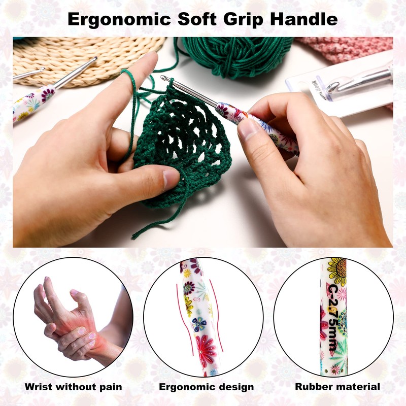 - 【Crochet Hooks with Comfortable Handles】Crochet hooks with ergonomic soft grip handles, can reduces or eliminates hand, wrist or finger pain. It is perfect for Arthritic Hands. Comfortable rubber handle provide a nice firm grip, you can crochet longer without discomfort