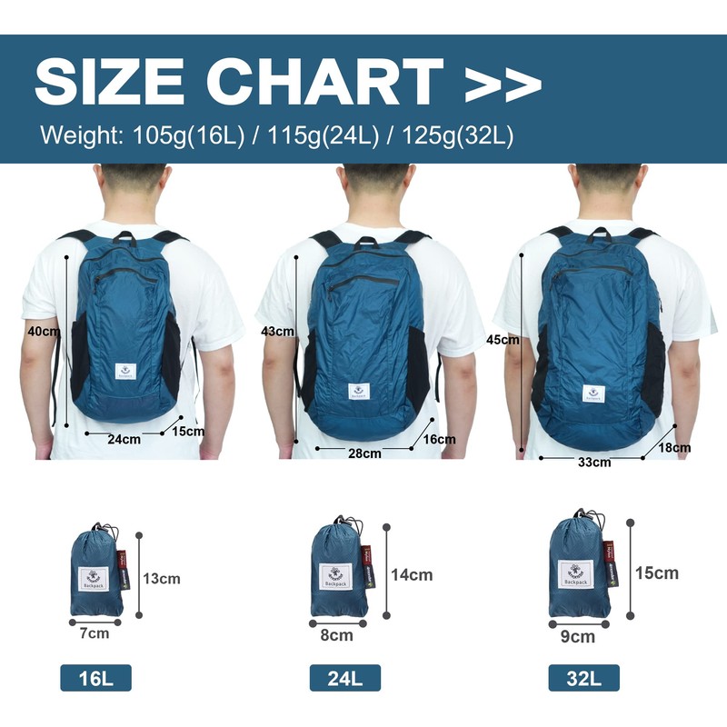 - Lightweight and compact: our foldable backpack is small and ultra-light. Easy to wear. Can be folded down to sandwich size and weighs no more than 130 g, about half the weight of a smartphone. It saves a lot of space and offers additional storage space for 16L/24L.