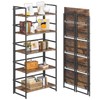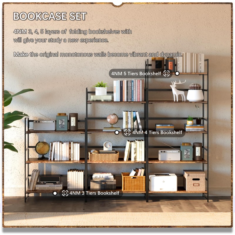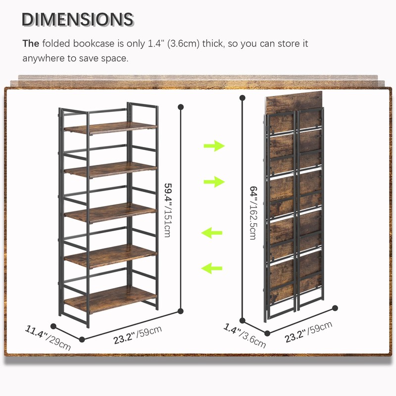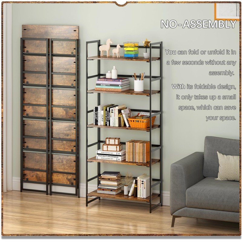 4NM 4NM 5 Tiers No Assembly Book Shelves, Black Folding Bookshelf Bookcase Open Industrial Foldable Shelves for Bedroom, Living Room, Home Office - Rustic Brown