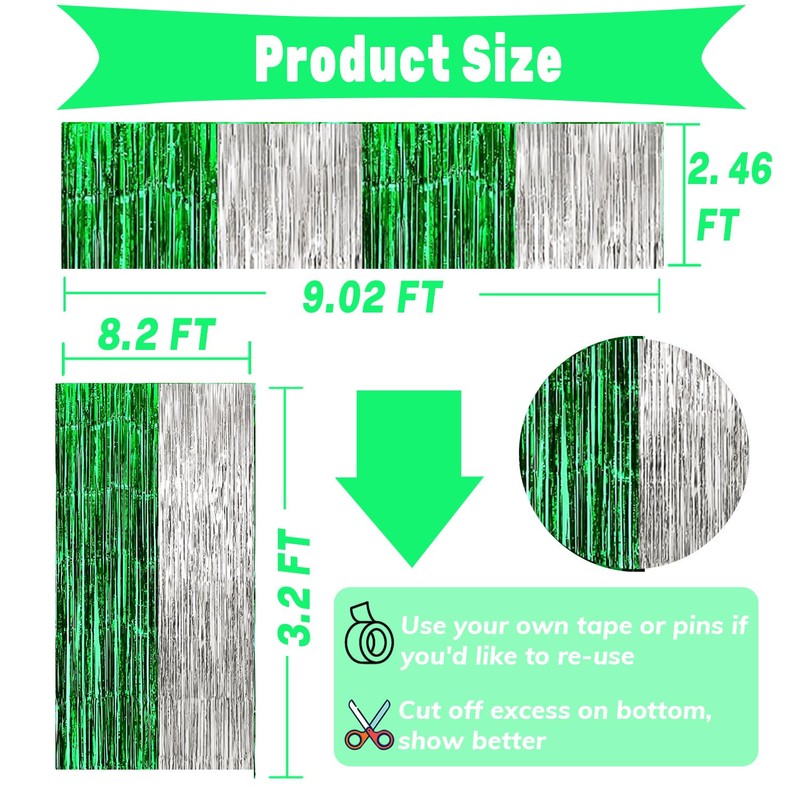 • Material: Plastic 2 Pack Party Streamers: 3.2ft x 8.2ft(W*L) 2 Pack Foil Fringe Tinsel Table Skirt: 30inx 108in(W*L) Please confirm the size you need before buying. Peel off the sticker on the back and stick it on the door you want to decorate, the size fit for any party backdrop, which can create an impressive decorative effect.