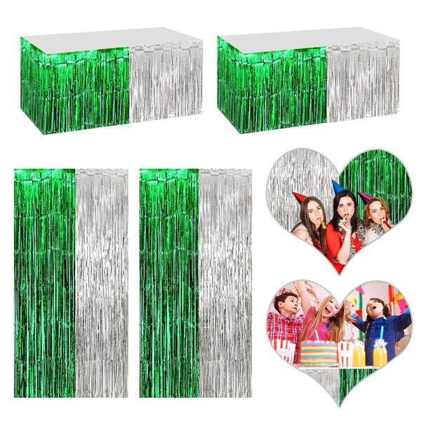 4P Metallic Foil Fringe Tinsel Table Skirts for Rectangle Tables Backdrop Banner Streamer Garland Curtains for Parade Floats Wedding Graduation Anniversary Birthday Parties Decoration (Silver green)