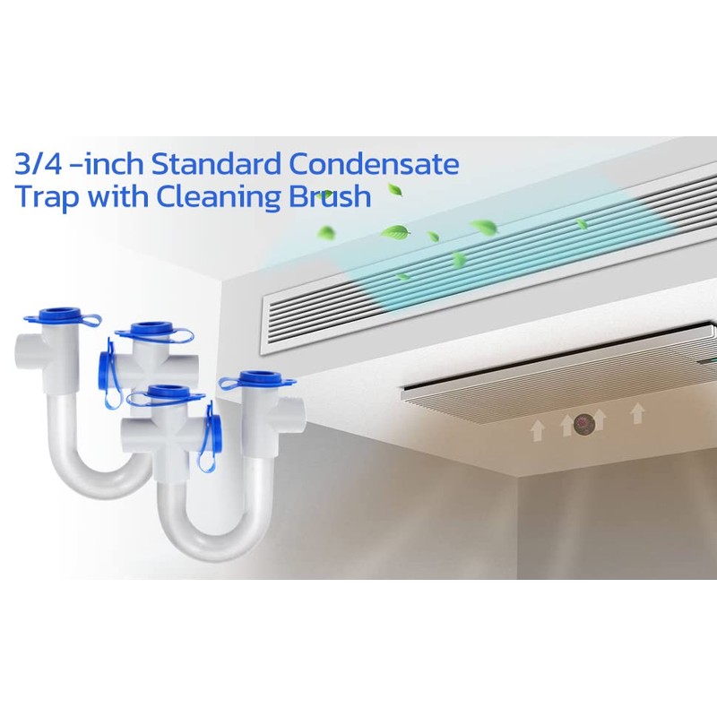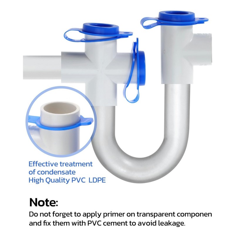 - Transparent U-tube design: The design of a transparent PVC U-tube and an open blue cover allows you to easily check for sediment blocking the trap and open it for cleaning. This steam trap provides an automatic air blocking and water sealing device for the air conditioning drainage pipe, preventing the return of dirty air and polluting indoor air.