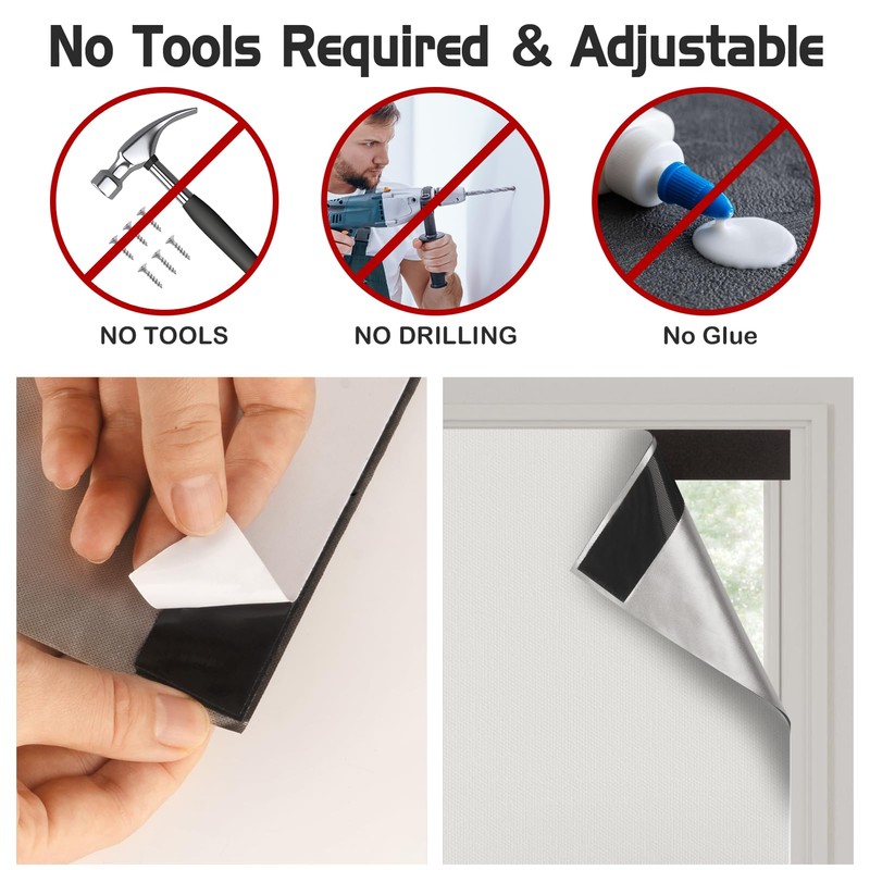 - Simple Installation and Adjustable:Features a cordless design meets the protection for children and pets,this darkout curtain is quick and easy to install without tools,using self adhesive tape that can be stuck to walls,glass,wood,metal,or other smooth surfaces. Comes with stainless steel clips adjustable height
