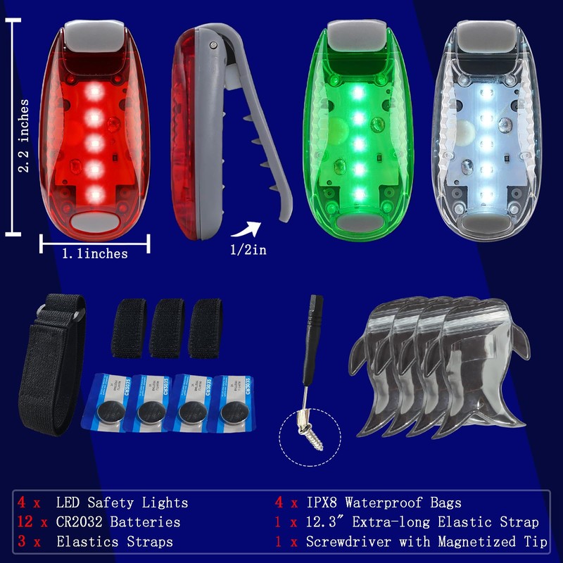- 【PACKAGE KIT AND WARRANTY】, this navigation light kit includes: 4pcs x LED lights, 12pcs x batteries, 2 IPX8 waterproof bags, 4pcs x elastic straps (1pc extra-long Armband strap), 1pc x screwdriver (with magnetized tip); With this safety light kit, you can relax and enjoy your safety journey at night. ONE YEAR WARRANTY, no hassle for return if there is any quality issue.