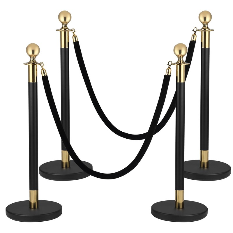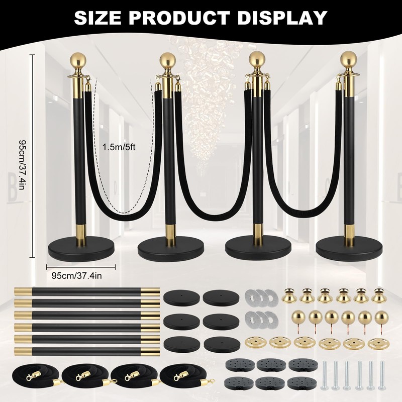 - Package Included: You can get 4 pieces Black & Gold Stanchion Poles with Golden Hollow Base, 4 pieces Rubber Bottoms, 2 pieces 5ft Black Velvet Ropes with lobster clips on both ends, Complete set can meet your fairs and parties needs.