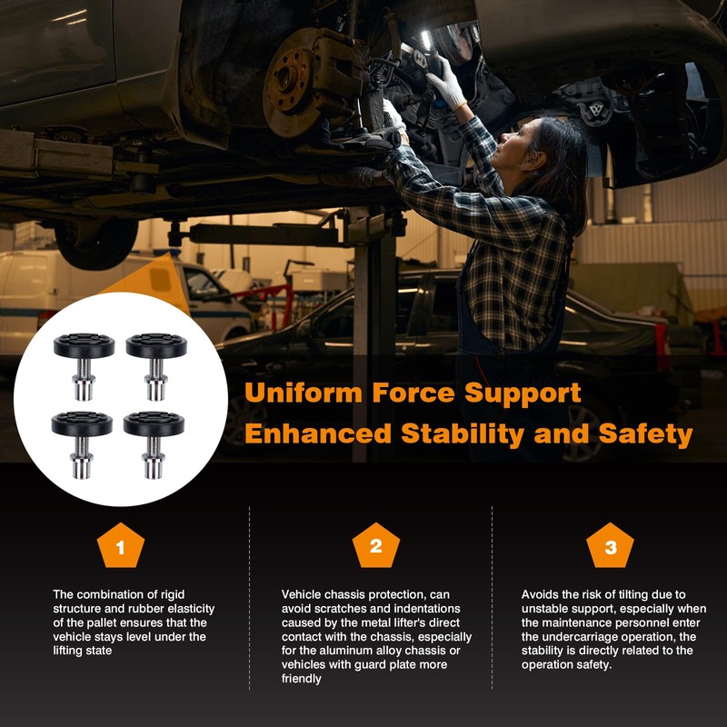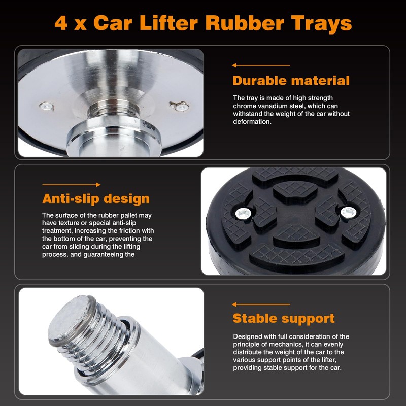 - High strength materials: The pallet is made from high strength chrome vanadium steel for durability, reliability and stability, and the car lift rubber mats provide additional stability to ensure the vehicle remains safe during the lift, reducing the risk of accidents.