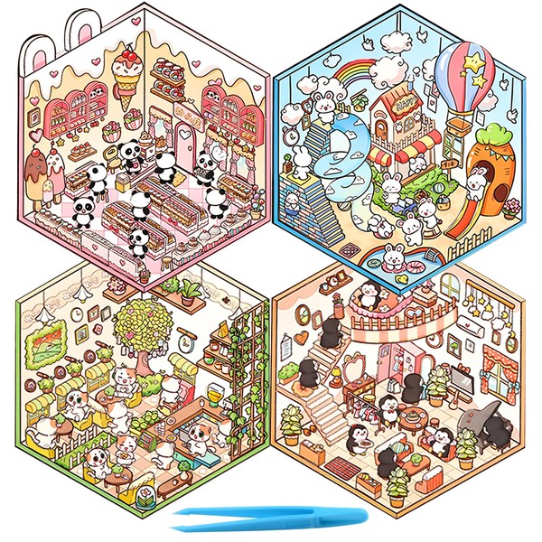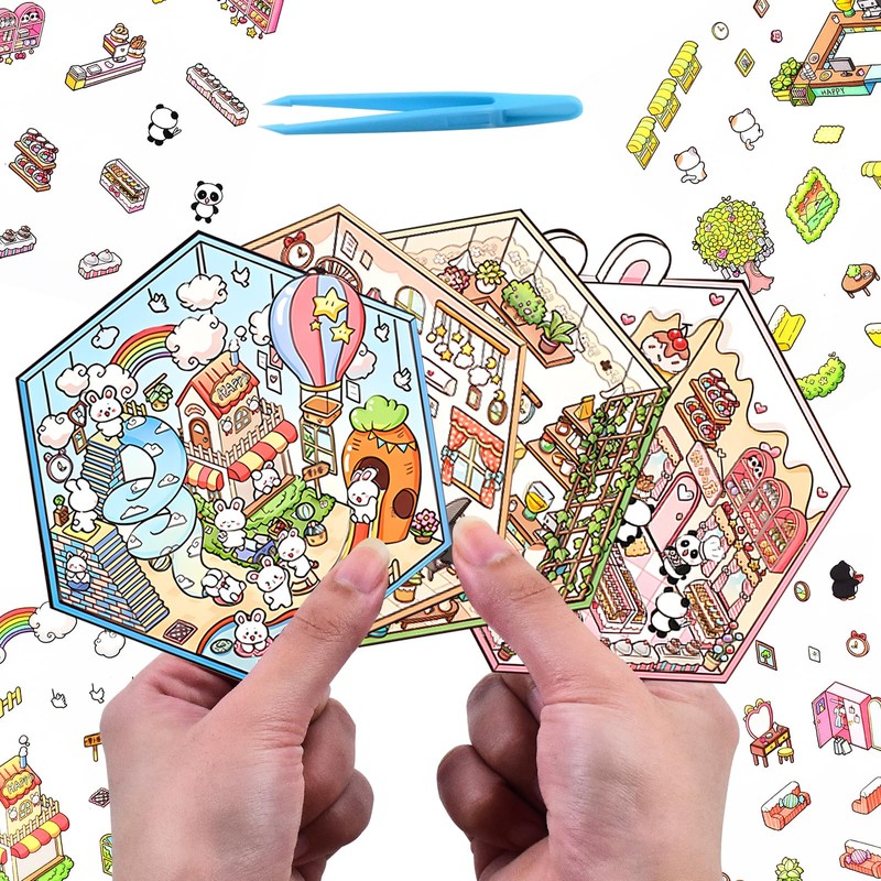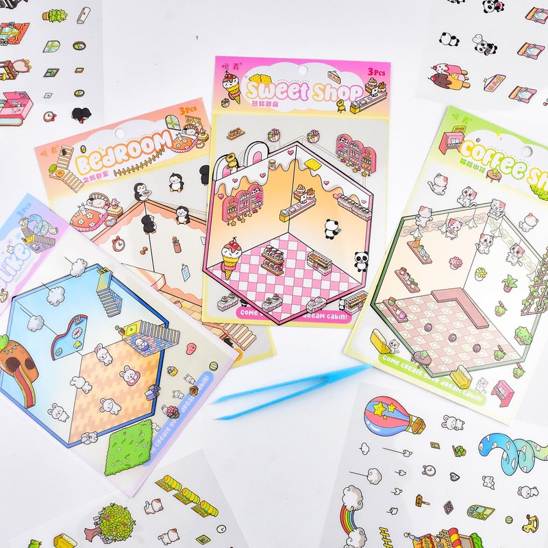 - DIY 3D House Stickers: You will receive 4pcs DIY 3D mini house scene stickers and a tweezer containing 4 different scenes including rabbit park, Penguin bedroom, Panda Sweet shop, cat cafe, very fun and creative.